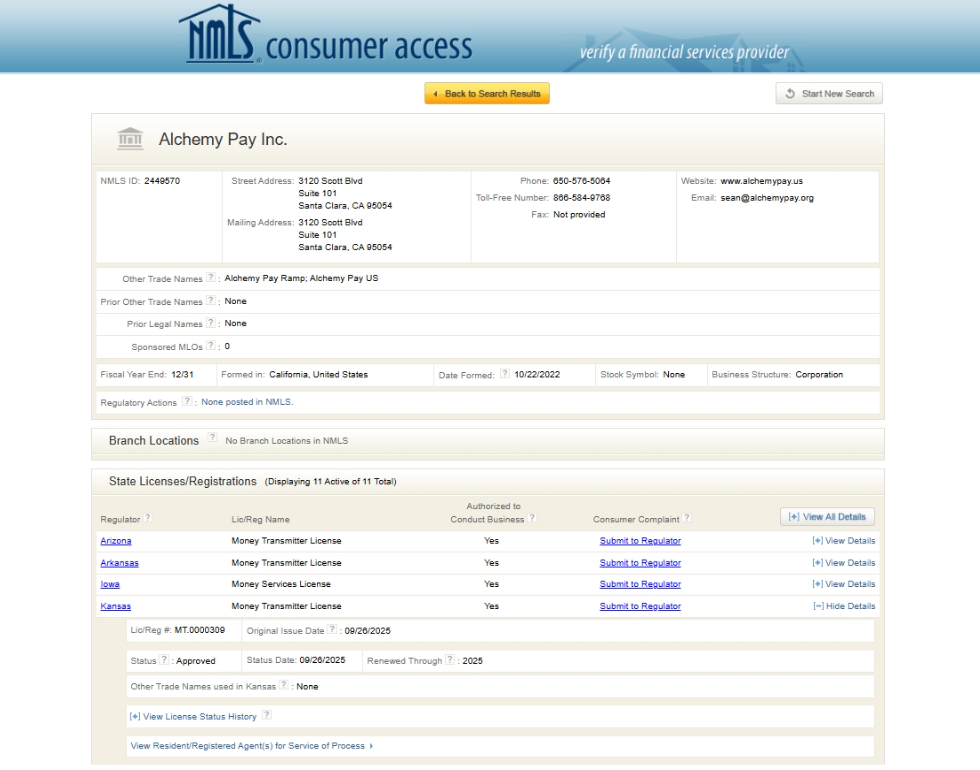 With the addition of Kansas, Alchemy Pay now holds Money Transmitter Licenses in eleven U.S. states, including Arkansas, Iowa, Minnesota, New Hampshire, New Mexico, Oklahoma, Oregon, Wyoming, Arizona, and South Carolina. This license represents the third MTL secured by Alchemy Pay in the U.S. in 2025, demonstrating an accelerated expansion of its regulatory footprint as the company continues to pursue licenses in multiple other jurisdictions.